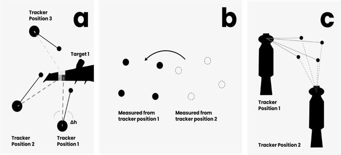 Cada estación consta de al menos tres puntos de referencia y las mediciones se realizan utilizando los haces de un seguidor en cada uno de estos puntos. El proceso se repite en la segunda estación. El software utiliza los datos de estas dos estaciones para crear una correlación. Esto se conoce como crear un haz para encontrar la alineación.